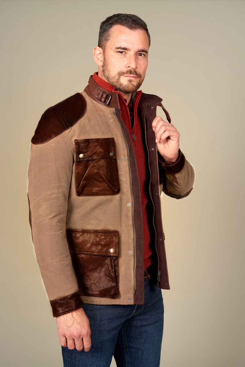 Leather inserts on the collar, button placket, bottom sleeves, shoulders, pockets and elbows