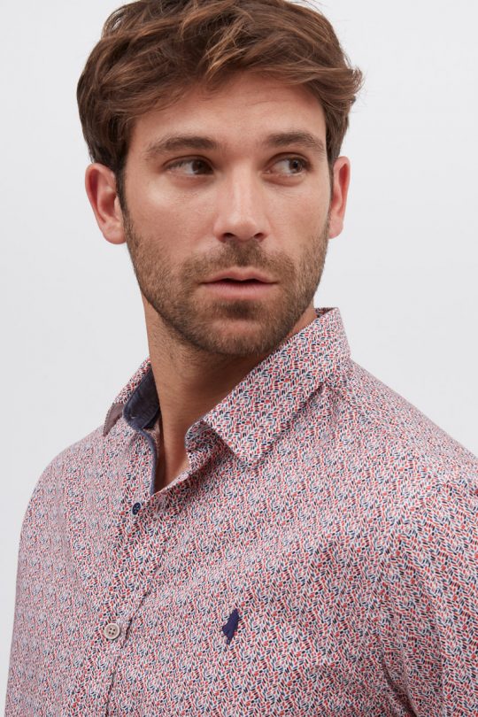 – Inside collar stand, underside of collar and inside cuffs in printed fabric and denim