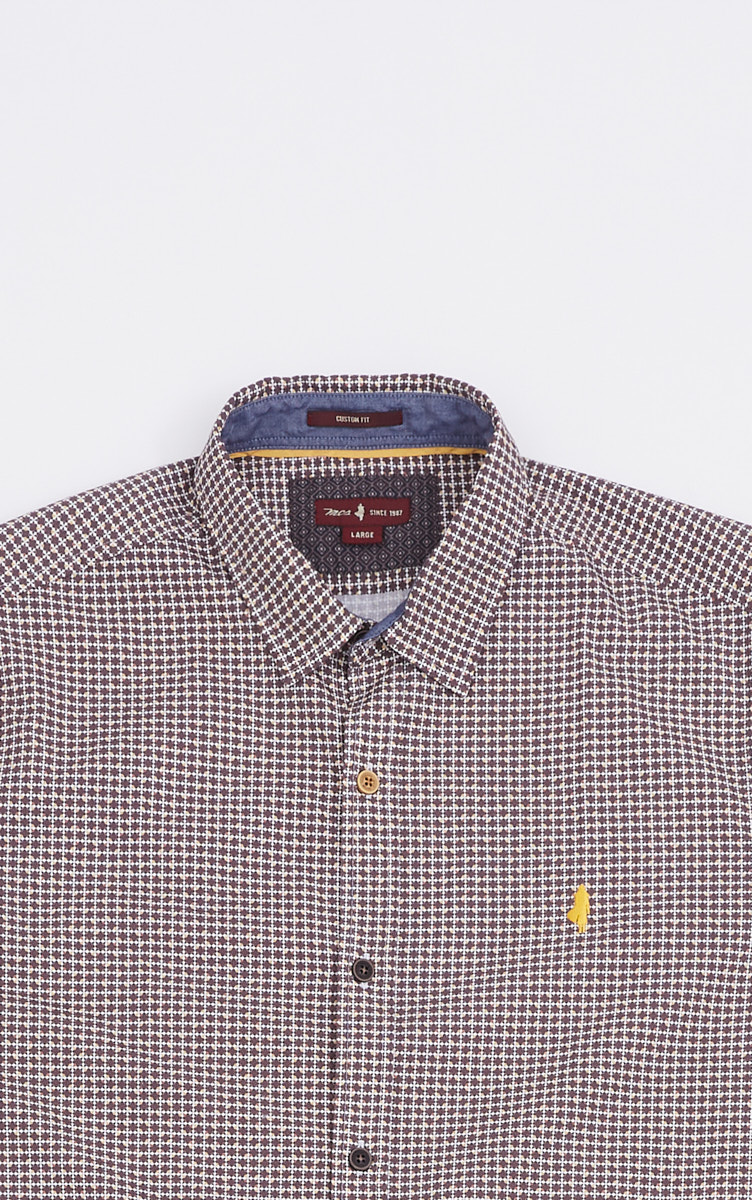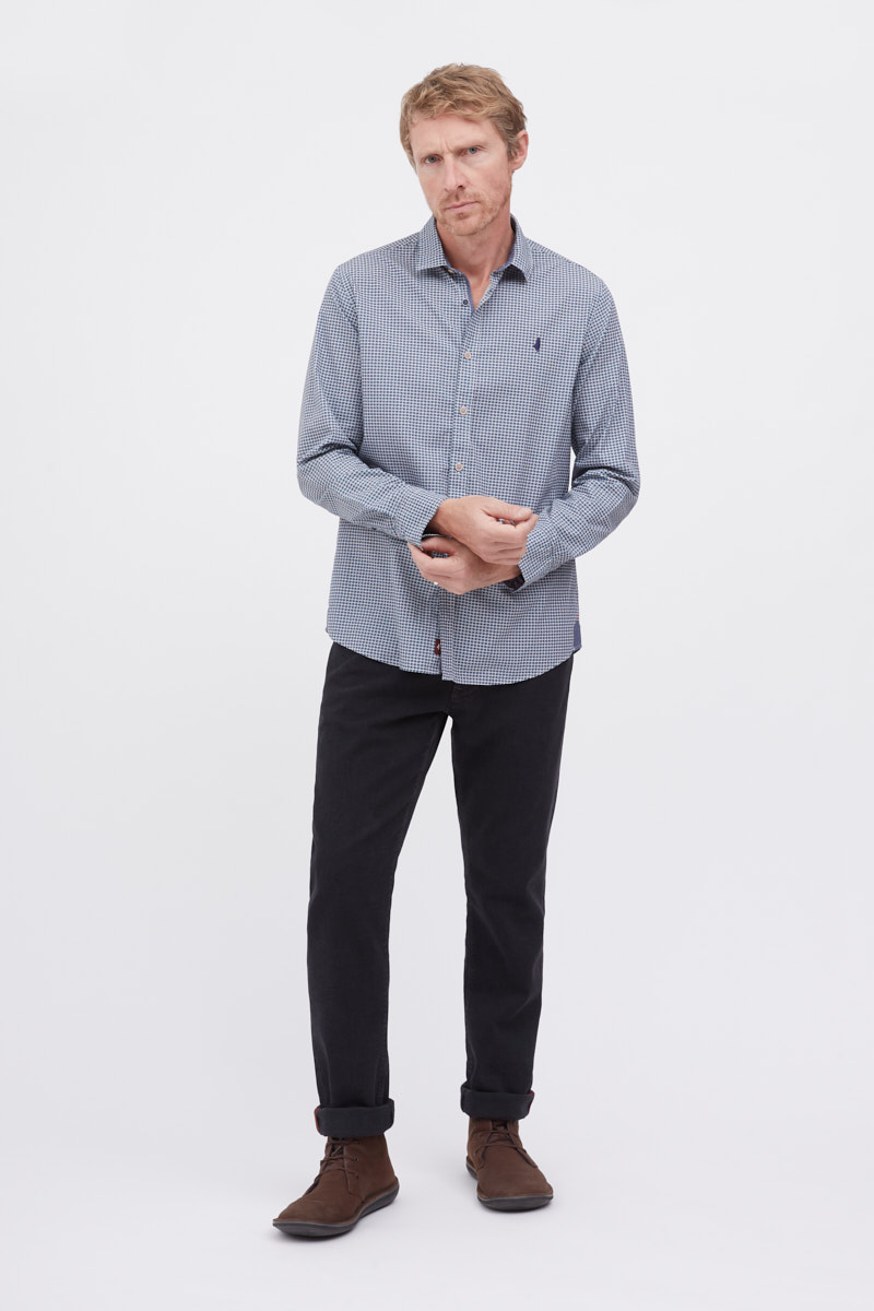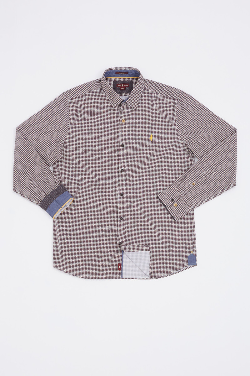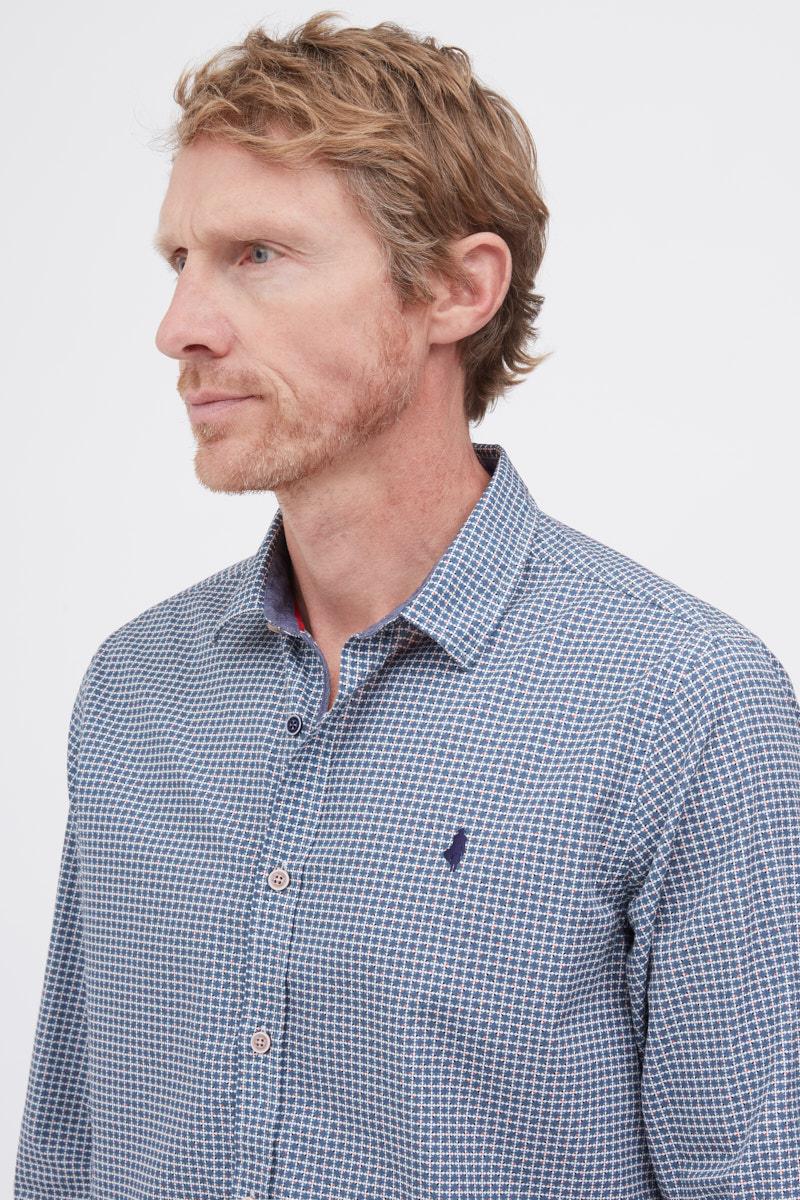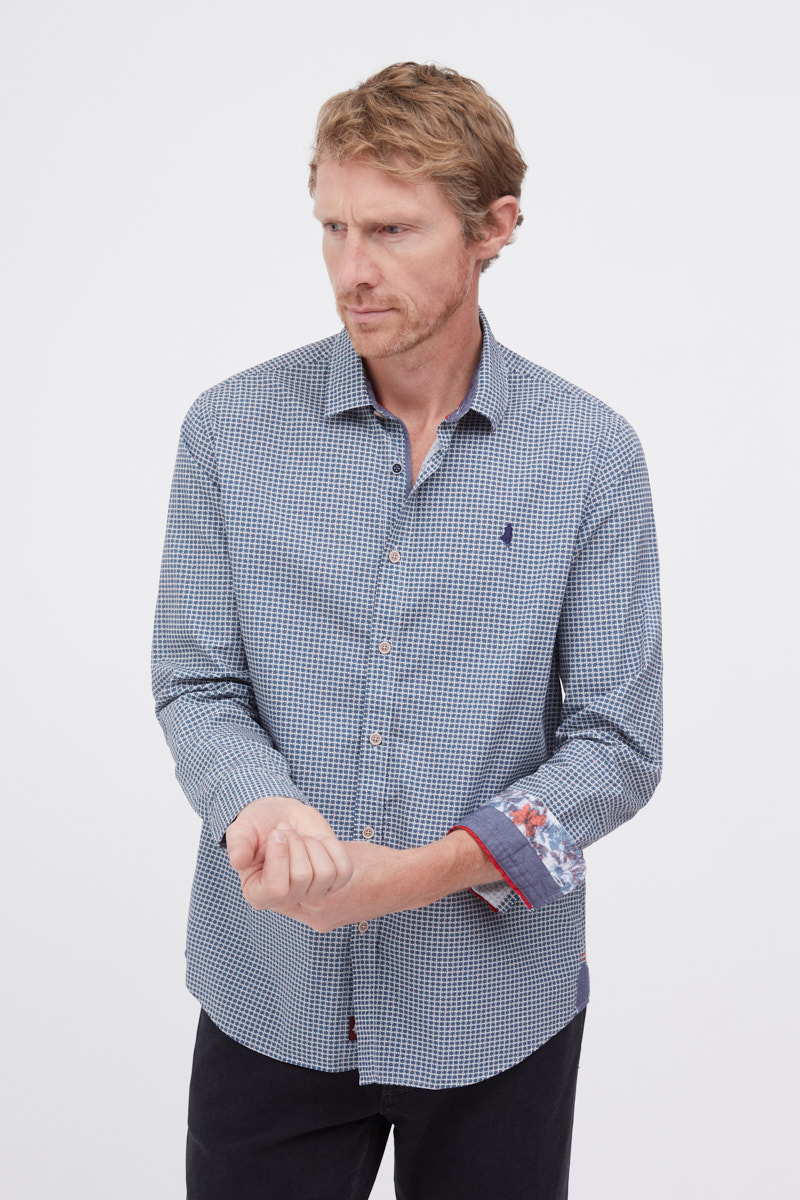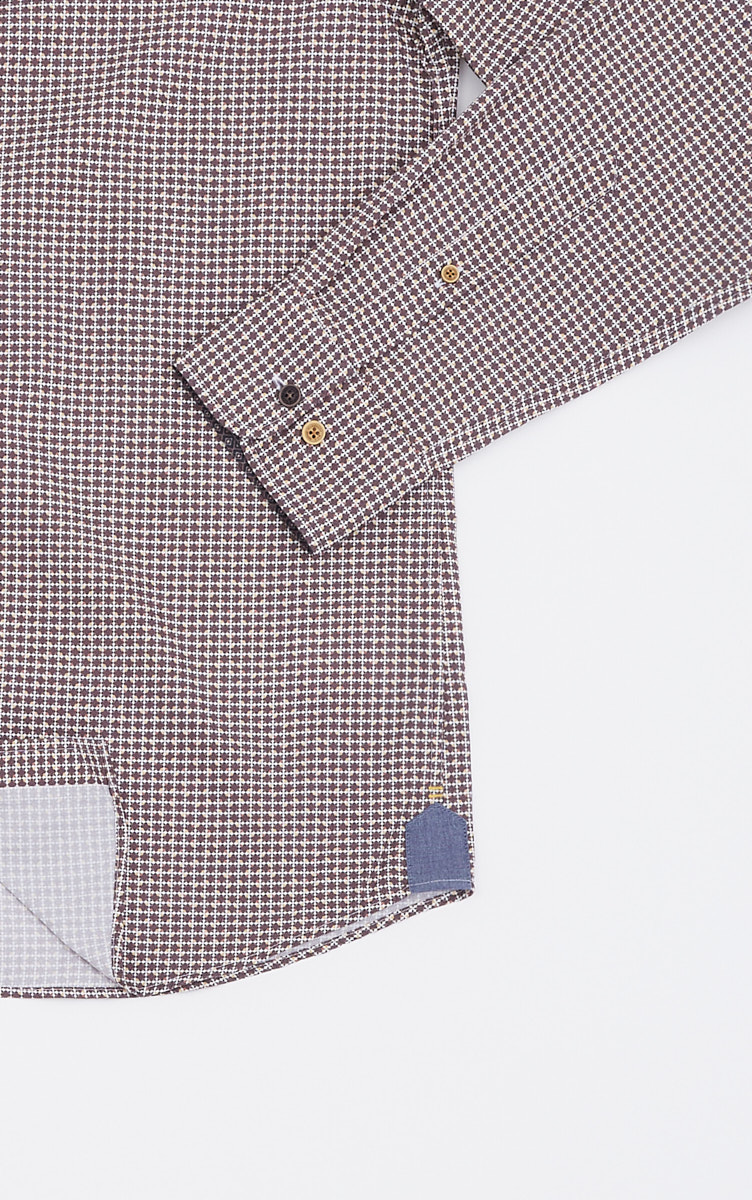 – Intérieur pied de col, dessous de col et intérieur poignets en tissu imprimé et denim